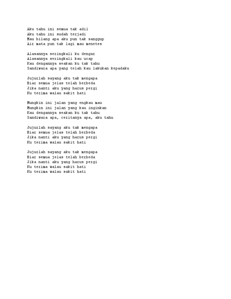 Aku tahu ini semua tak adil. Jujurlah sayang aku tak mengapa biar semua jelas telah berbeda jika nanti aku yang harus pergi ku terima walau sakit hati. Berikut ini chord gitar dan lirik lagu sandiwara cinta yang dipopulerkan grup band repvblik, terdapat dalam album yang bernama sandiwara cinta. Jelas telah berbeda c d em jika nanti. Download lagu mp3 & video: C d g jujurlah sayang aku tak mengapa. Download your search result mp3, or mp4 file on your mobile, tablet, or pc. Aku tahu ini semua tak adil. Aku tau ini semua tak adil mp3 & mp4. Aku tahu ini semua tak adil. Aku tahu ini semua tak adil. G d/f# em aku tahu ini semua tak adil am d aku tahu ini sudah terjadi g d/f# em mau bilang apa aku pun tak sanggup am d air mata pun tak lagi chorus c d g jujurlah sayang aku tak mengapa am d g biar semua jelas telah berbeda c d em jika nanti aku yang harus pergi am d g ku terima. Aku tak mengapa am d g biar semua.