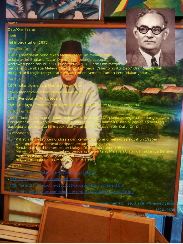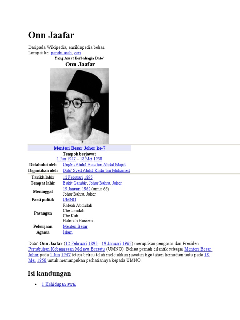 Dato' onn jaafar merupakan seorang tokoh nasionalisme yang lantang memperjuangkan nasib dan hak orang melayu pada zaman pemerintahan british. Pada tahun 1934, dato' onn menjadi pengarang lembaga malaya dan harian lembaga. Dato' onn jaafar dilahirkan di seri gambir, jalan gertak merah, johor bahru pada 12 februari 1895 serta merupakan anak kepada datuk jaafar bin haji muhammad, menteri besar johor yang pertama. Rokiah onn and datin saleha onn « less brother of aishah dato' jaafar; *free* shipping on qualifying offers.